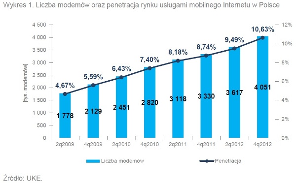 Porównanie średnich kosztów dostępu mobilnego wskazało na wyraźną obniżkę cen usługi w wariancie abonamentowym. W przypadku ofert dla klientów indywidualnych, najwyższe spadki charakteryzowały taryfy z pakietem 15-20 GB – abonent decydujący się na taką opcję w marcu 2013 r. zapłaciłby o ponad 31% mniej niż w styczniu 2012 r. Dla klientów biznesowych największe obniżki, na poziomie ponad 21%, odnotowano dla dostępu z niskim limitem transferu  (do 2 GB). W przeciwieństwie do usług abonamentowych, średnie wydatki na Internet na kartę nie uległy istotnym zmianom w porównaniu do 2012 r.